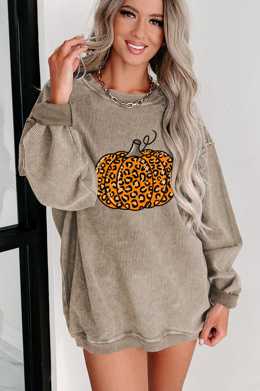 Khaki Leopard Halloween Pumpkin Graphic Corded Sweatshirt