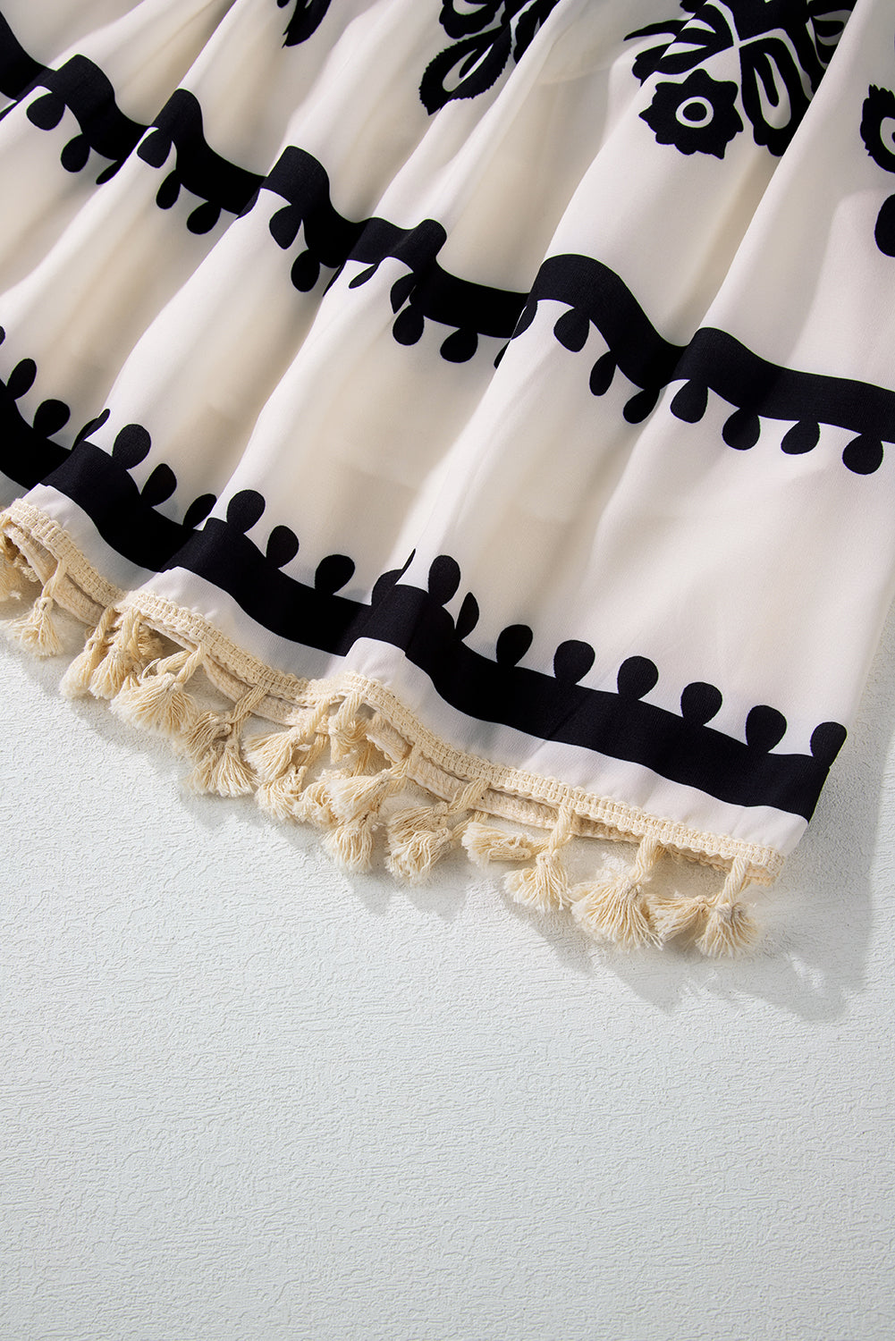 The chic tasseled edge draws the eye and enhances the dress's appeal.