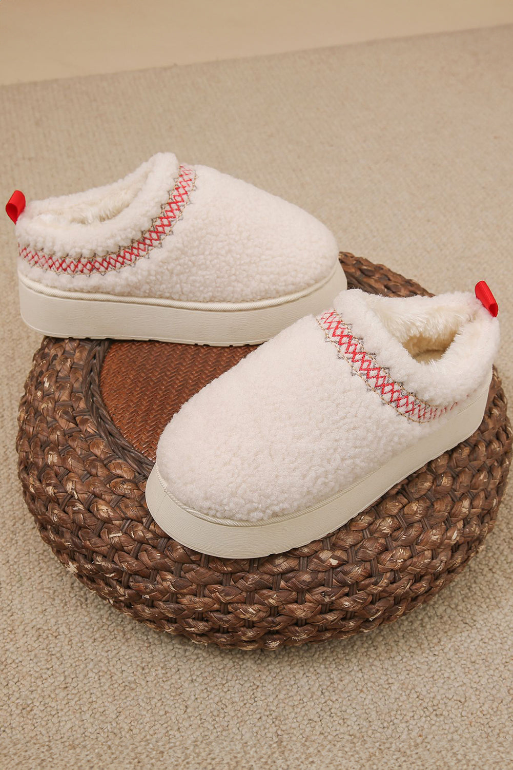White Embroidered Sherpa Plush Thick Sole Winter Slippers